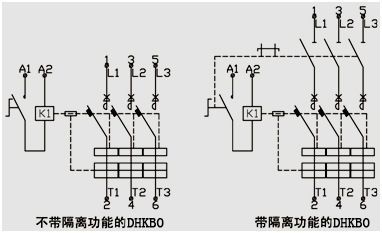 DHKBO結(jié)構(gòu)采用倒裝式設(shè)計(jì),接觸組觸頭及滅弧系統(tǒng)在安裝面底部,操作機(jī)構(gòu)及電磁傳動(dòng)機(jī)構(gòu)在觸頭及滅弧系統(tǒng)的上部。觸頭的分合通過電磁傳統(tǒng)機(jī)構(gòu)的銜鐵的吸合、斷開來實(shí)現(xiàn)。操作機(jī)構(gòu)可通過就地或遠(yuǎn)程控制電磁傳動(dòng)機(jī)構(gòu)的線圈通斷來控制產(chǎn)品接觸組的主觸頭通斷。
